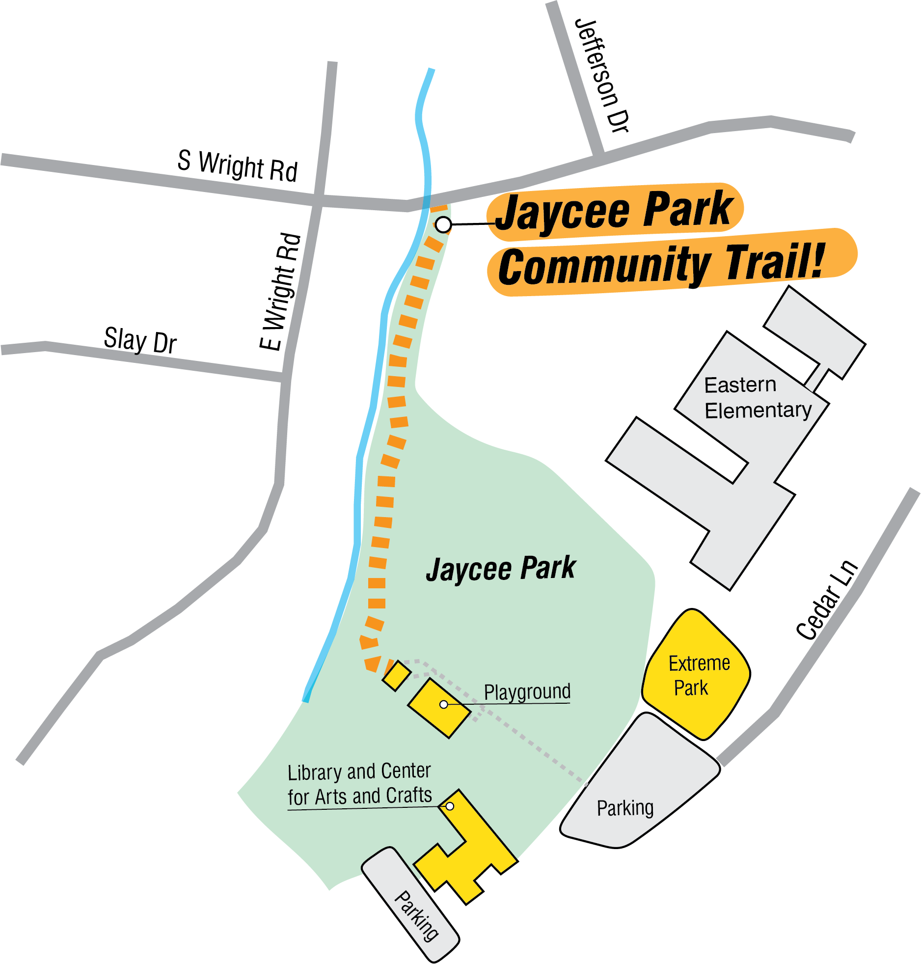 This project, run in collaboration with Greenville Recreation & Parks and Pitt County Schools, connects South Wright Rd. to Jaycee Park and the Sheppard Memorial Library East branch. The trail officially opened on March 22nd, 2025. Please use responsibly!